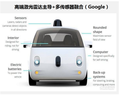 目前,國際上自動駕駛環(huán)境感知的技術(shù)路線主要有兩種:一種是以特斯拉為代表的毫米波雷達(dá)主導(dǎo)的多傳感器融合方案,另一種以高成本激光雷達(dá)為主導(dǎo),典型代表如谷歌Waymo。我們來分析一下這兩條線路對前方路況分析所使用的傳感器: