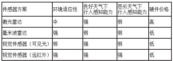 上表中可以看出,目前主流的針對前向的傳感器融合方案都有一個顯著的缺點(diǎn):在惡劣天氣情況下,只有毫米波雷達(dá)一個單傳感器可以起到作用,而毫米波雷達(dá)自身又難以識別行人。故現(xiàn)有的技術(shù)方案只能在正常天氣下工作,在惡劣天氣環(huán)境下(特別是光線不好的情況)會對路上行人的生命會造成極大的威脅。